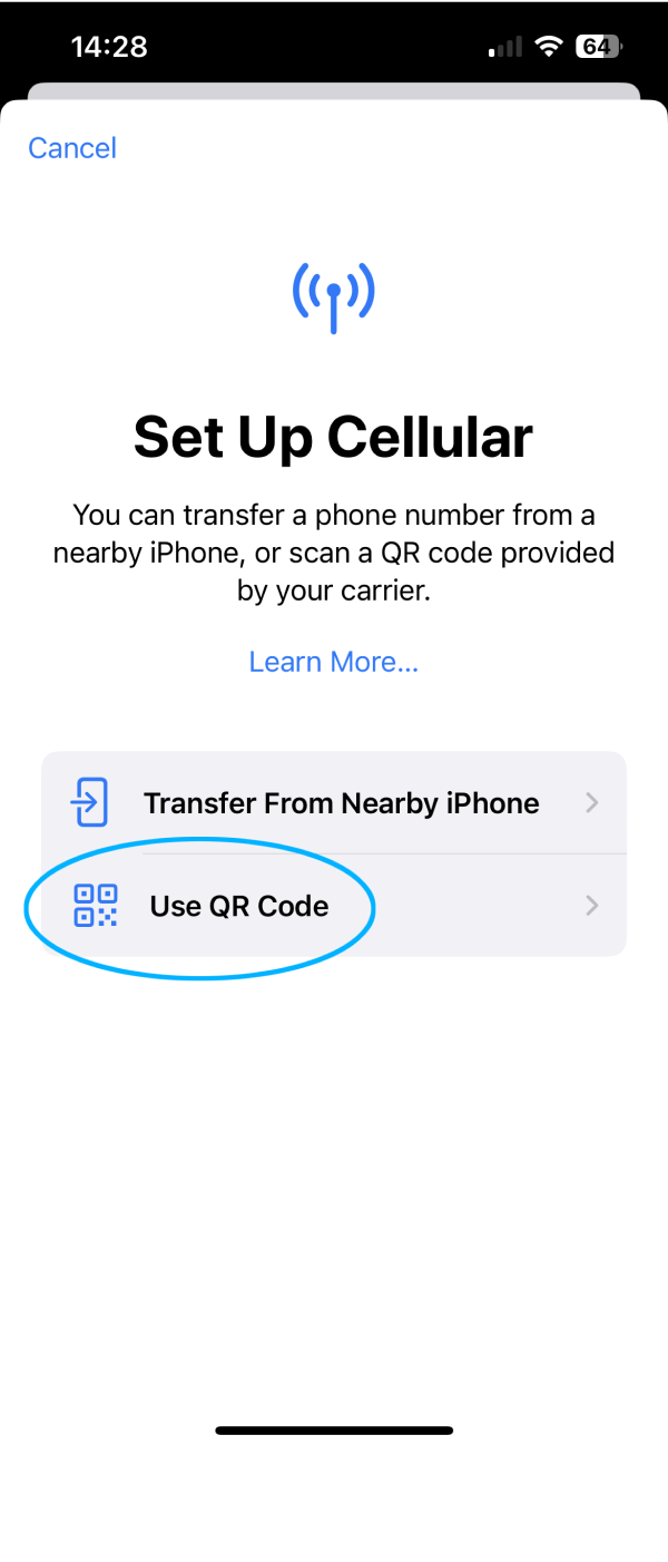 'In this step, you will add a new, secondary data plan to your phone using the QR code. Note: If you can't use the Camera to scan a QR code, try Activate an eSIM with Manual Activation Code.